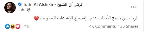 وخرج تركي آل الشیخ للردّ على ما يتداول عنه، وقال في تغريدة: “الرجاء من جمیع الأحباب عدم الاستماع للإشاعات المغرضة”.
