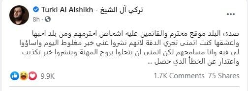 وأبدى تركي آل الشيخ استياءه من موقع مصري نشر خبر طرده من هيئة الترفيه السعودية، وطالبهم بالإعتذار عن “الخطأ”.