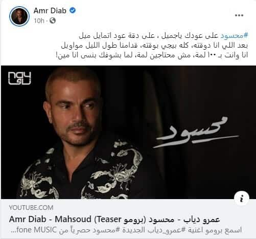 في الوقت الذي تنتشر فيه المعلومات غير المؤكدة عن انفصاله عن حبيبته دینا الشربیني طرح الفنان عمرو دياب برومو أغنيته الجديدة “محسود” عبر منصاته على مواقع التواصل .