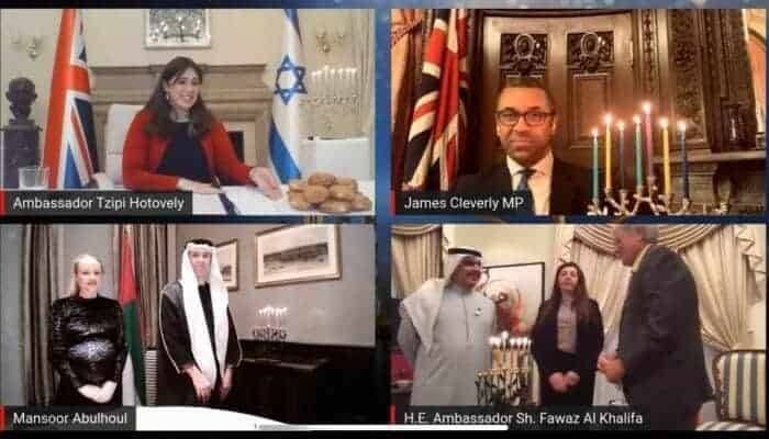 شارك سفيرا كل من الإمارات والبحرين، سفيرة دولة الاحتلال الإسرائيلي في العاصمة البريطانية لندن، في الحفل الافتراضي بمناسبة عيد “حانوكا” اليهودي الذي تم إقامته هناك، رغم إلحاح ودعوة ما قرابته 100 عالم مسلم ومنظمة بريطانية للسفيرين من أجل الانسحاب من المشاركة في الحفل.