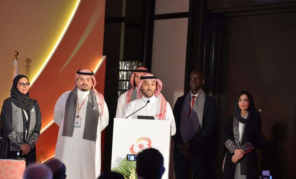 ليرد بعدها وزير الرياضة السعودي “عبد العزيز بن تركي الفيصل” أثناء كلمته ويبدأ برد التحية لشقيق الأمير تميم بالقول: “دعوني أبدأ بتوجيه الشكر للشيخ جوعان بن حمد على التزامه تجاه الرياضة”.