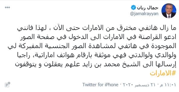 وقال ريان، في تغريدة رصدتها “وطن”: “ما زال هاتفي مخترق من الامارات حتى الآن، لهذا فإنني ادعو القراصنة في الامارات إلى الدخول في صفحة الصور الموجودة في هاتفي لمشاهدة الصور الجنسية المفبركة لي ولوالدي ولوالدتي فهي موثقة بأرقام هواتف إماراتية، راجيا إرسالها الى الشيخ محمد بن زايد علهم يعقلون ويتوقفون”.