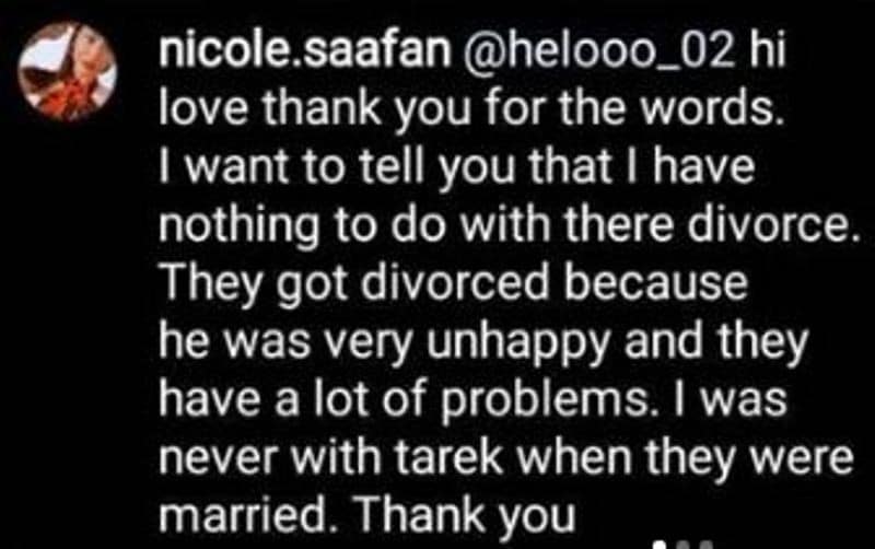 وقالت نيكول سعفان حبيبة طارق العريان :” أريد أن أخبرك أنني ليس لي دخل في طلاقهم، والطلاق حدث لأنه لم يكن سعيدا، وجرى بينهم الكثير من المشاكل، ولم أكن مطلقا مع طارق العريان عندما كانوا متزوجين”.