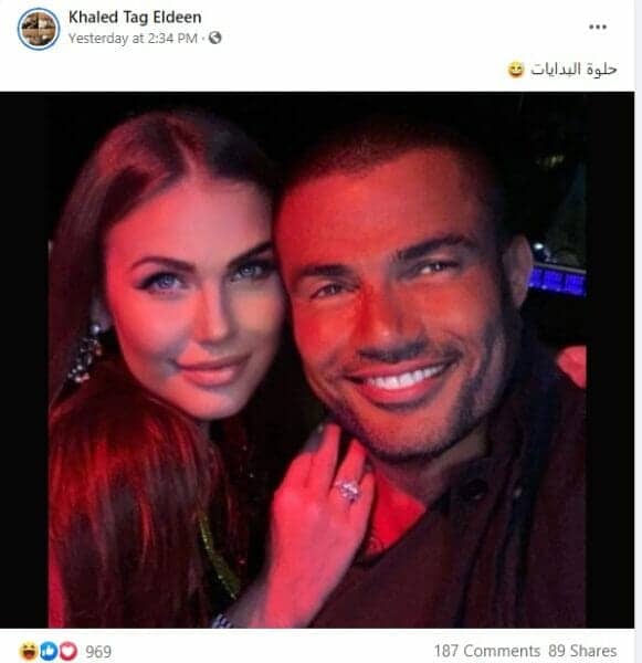 وكانت البداية حين نشر الشاعر المصري خالد تاج الدين صورة عبر حسابه على “فيسبوك لعمرو دياب، برفقة فتاة حسناء خلال تواجده في دبي، وعلق عليها مقتبساً أغنية الهضبة “حلوة البدايات”.