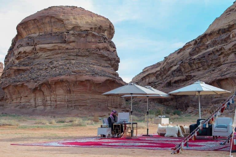 وظهر ابن سلمان من قلب خيمة بدوية وهو يتواصل عبر الانترنت مع المشاركين بالمؤتمر، وعلق بدر العساكر بقوله:””سمو سيدي ولي العهد يشارك في جلسة حوار استراتيجية ضمن فعاليات المنتدى الاقتصادي العالمي، بحضور أكثر من 160 من قادة ورواد الأعمال المؤثرين الدوليين مثلوا 28 قطاعًا و36 دولة”