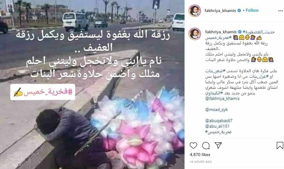 ونشرت فخرية خميس صورة لطفل يبيع حلوى “شعر أو غزل البنات”، وقد أنهكه التعب فنام على الرصيف.