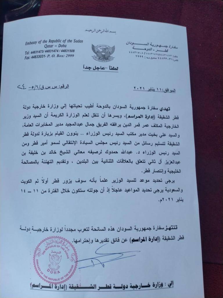 جاء ذلك، بعد تناقل خطاب بعثه السفير الصديق إلى الخارجية القطرية يطلب فيها ترتيب لقاء لزيارة وفد سوداني للدوحة لتهنئة قطر بانتصارها في المصالحة الخليجية.