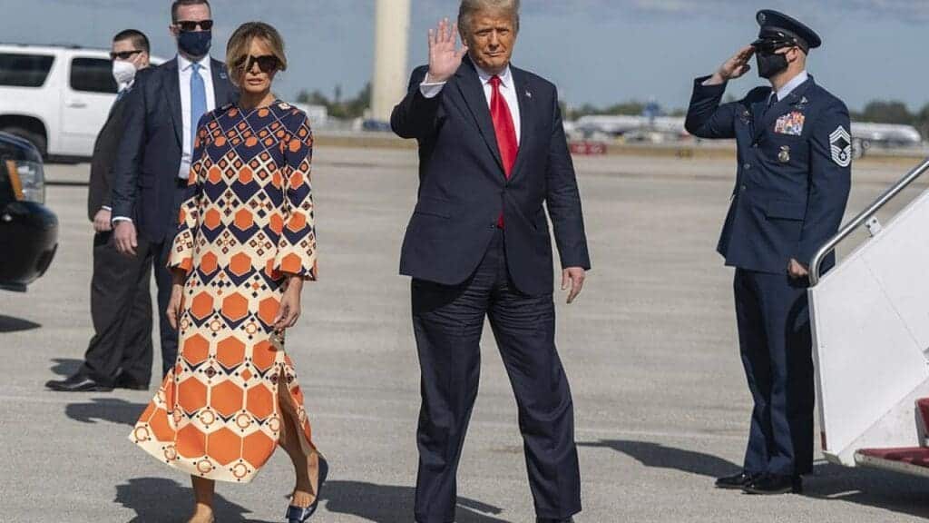وظهرت ميلانيا برفقة ترامب الذي وقف يلوّح بيده أمام المصورين بمطار “بالم بيتش”. بينما واصلت زوجته وهي عابسة الوجه مسيرها دون توقف.