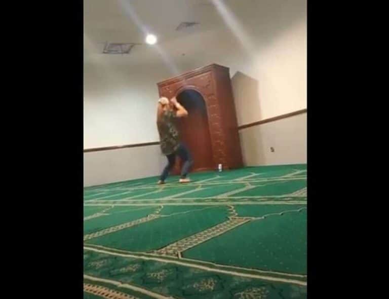 ويظهر بالفيديو الذي انتشر على نطاق واسع، سيدة متبرجة بلا حجاب تقف في المصلى، وترتدي بنطال جينز وتيشرت ضيق، وتضع هاتفها أمامها للتصوير.