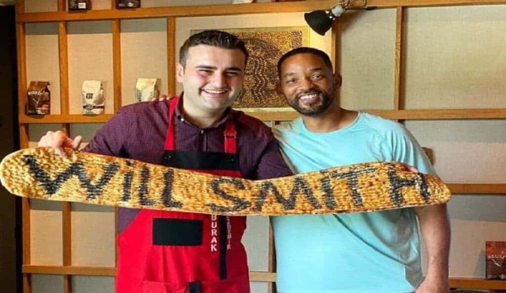 وكتب بوراك في تعليق بالتركية على صورة نشرها إلى جانب ويل سميث، وهو يحمل قطعة خبز كبيرة اسم نجم هوليوود: “أهلا أخي”.