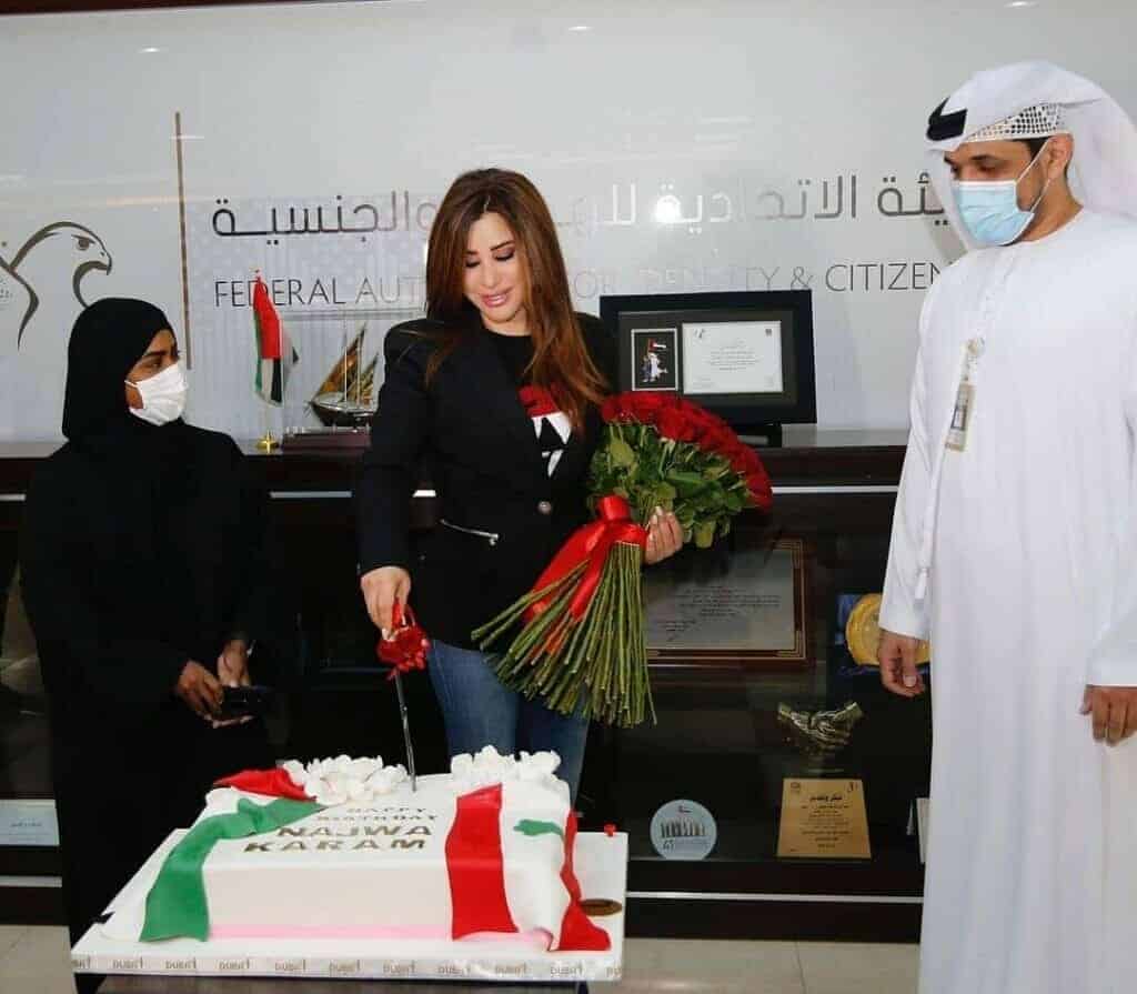كما نشرت نجوى كرم على حسابها الشخصي بموقع “انستجرام” مجموعة صور توثق استلامها الإقامة الذهبية، ووضع البصمة الإلكترونية عليها، بوجود قالب حلوى عليه علم لبنان والإمارات معاً.