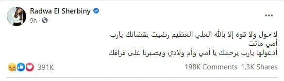 وكتبت رضوى الشربيني منشوراً عبر حسابها الرسمي على “فيسبوك“، قالت فيه: “لا حول ولا قوة إلا بالله العلي العظيم رضيت بقضائك يارب، أمي ماتت، ادعو لها يا رب يرحمك يا أمي وأم ولادي، ويصبرنا على فراقك”.