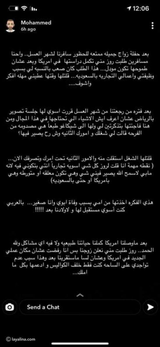 وكتب محمد الحمود الذي عرف نفسه بأنه زوج مودل روز، عبر حسابه على “سناب شات”: “بعد حفلة زواج جميلة ممتعة للحضور سافرنا لشهر العسل. وأثناء سفرنا طلبت مني روز أن تكمل دراستها في أمريكا، وأيضاً من أجل تحقيق طموحها بأن تصبح عارضة أزياء”.