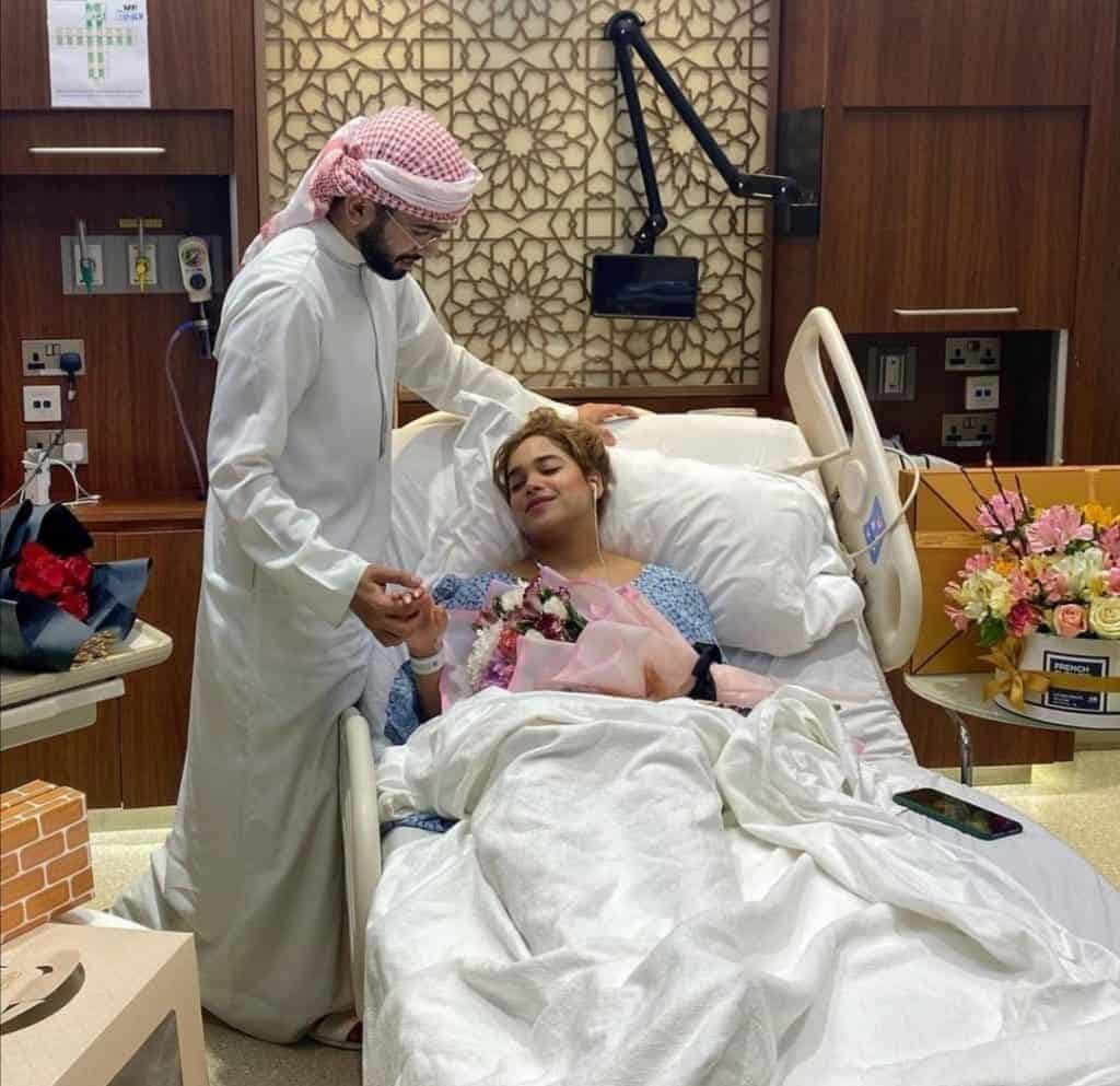 وظهرت مشاعل الشحي بصور أخرى على سرير المستشفى، وبجوارها زوجها الإعلامي الإماراتي أحمد خميس.