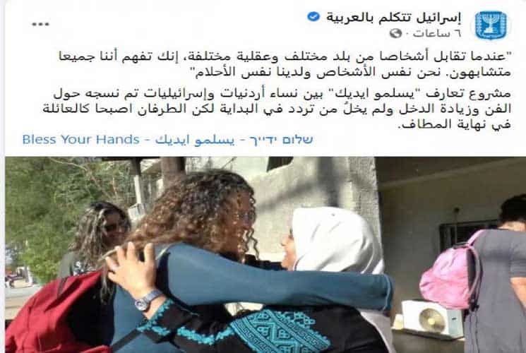 وتابعت: “مشروع تعارف (يسلمو ايديك) بين نساء أردنيات وإسرائيليات تم نسجه حول الفن وزيادة الدخل ولم يخلُ من تردد في. البداية لكن الطرفين أصبحا كالعائلة في نهاية المطاف”.