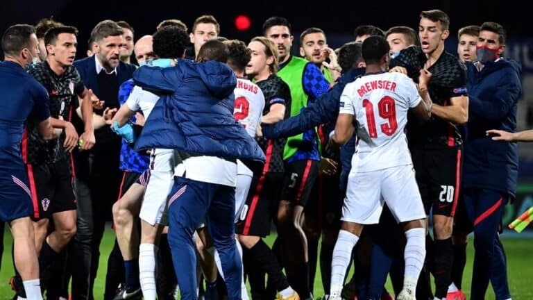 أثناء احتفال لاعبي منتخب منافسه كرواتيا بالتأهل على حساب منتخب إنجلترا. في دور المجموعات لكأس الأمم الأوروبية للشباب تحت سن 21 عاماً. والتي جمعت المنتخبين يوم أمس الأربعاء، لتشهد مشادات عنيفة بين لاعبي المنتخبين.