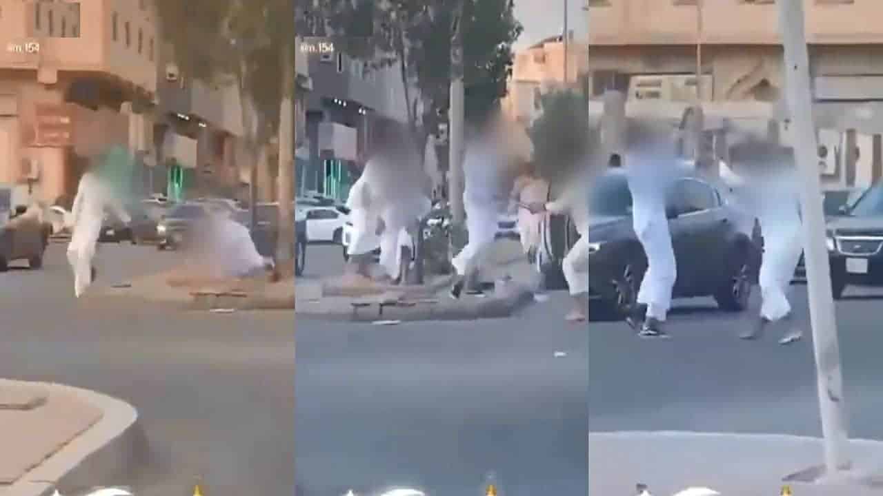 ووثق المقطع المتداول والذي رصدته “وطن” قيام عدد من الأشخاص بالاعتداء على بعضهم بالضرب بالأيدي والركل والأحذية والعقالات، وسط الطريق وبين السيارات.