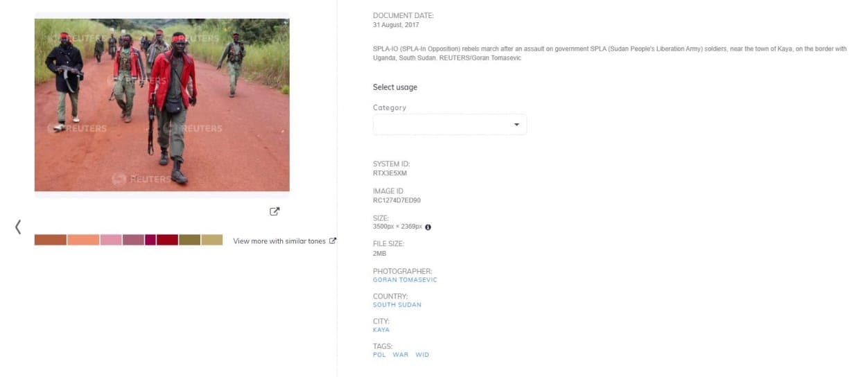 وجاء في التعليق المرافق للصورة أنها تعود للحركة الشعبية لتحرير السودان في المعارضة بعد هجوم على الجيش الحكومي، قرب بلدة كايا على الحدود مع أوغندا وجنوب السودان في 31 آب/أغسطس 2017.