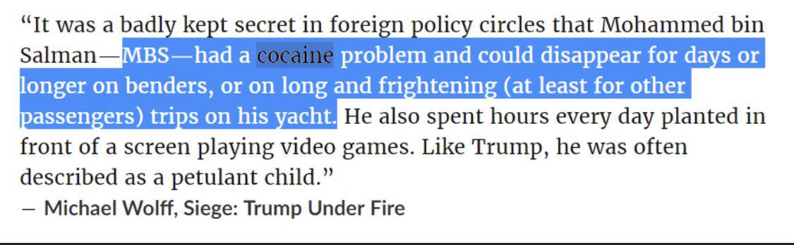 وكشف الكاتب الأمريكي الشهير مايكل وولف أن وليّ العهد السعودي محمد بن سلمان يعاني من مشكلة مزمنة وهي تعاطي الكوكايين وألعاب الفيديو.
