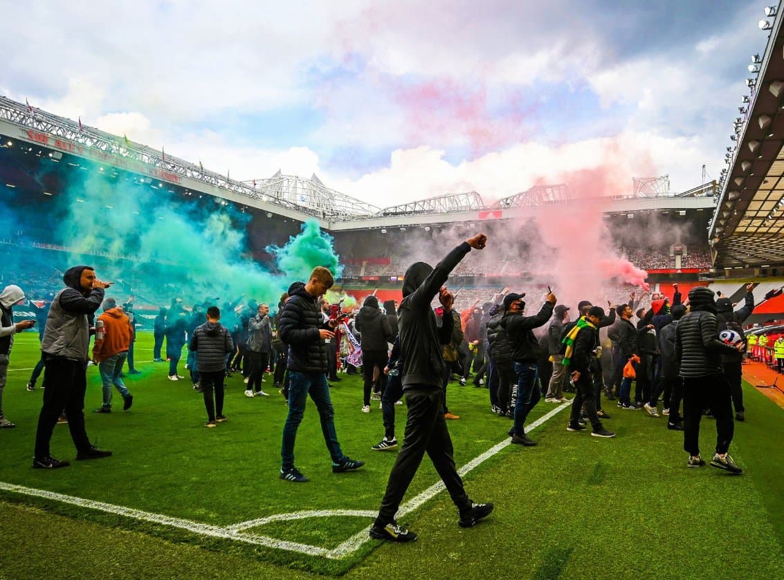 وقد حمل العشرات من جماهير فريق مانشستر يونايتد، أرض ملعب “أولد ترافورد”. الذين رقعوا لافتات وأشعلوا النيران، احتجاجًا على ملاك عائلة “غليزر” الأمريكية. قبل ساعة من خوض المباراة مع فريق ليفربول.