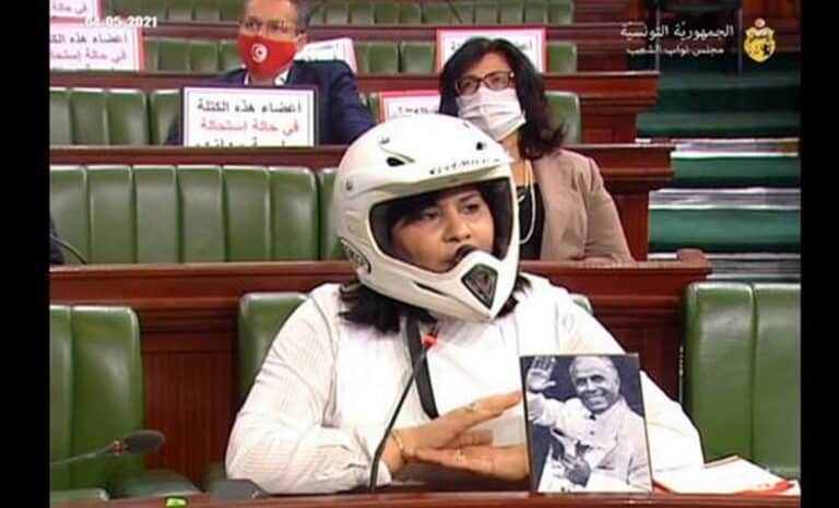 تسببت النائبة التونسية المدعومة بأجندة خارجية من الإمارات في موجة جدل واسعة بين التونسيين بعد ظهورها اليوم، الثلاثاء، داخل البرلمان التونسي مرتدية خوذة وقميص واقي ضد الرصاص.