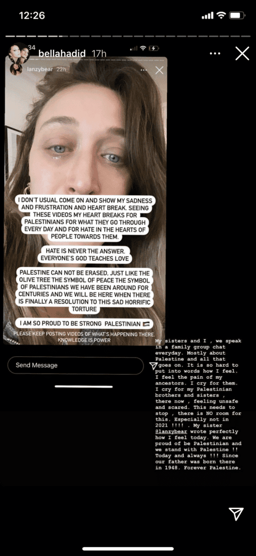 بيلا حديد تدعم الفلسطينيين عبر انستغرام: