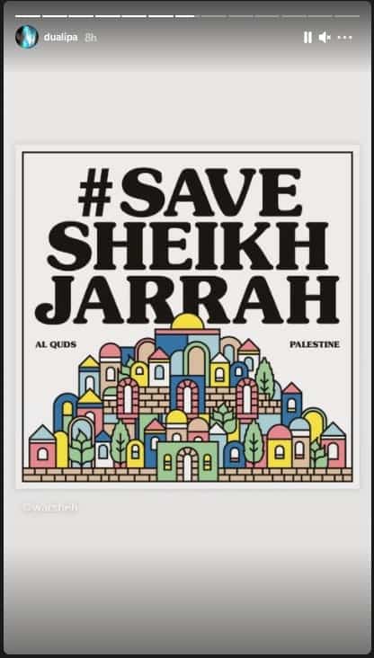 ولم يقتصر التضامن مع القدس على الفنانين العرب، فقد نشرت الفنانة البريطانية الشهيرة دوا ليبا عبر خاصية (الستوري) على (انستجرام) صورة تعبيرية وجهت خلالها رسالة إلى متابعيها البالغ عددهم أكثر من 65 مليون شخص، تطالب فيها بدعم فيها القدس والشعب الفلسطيني، وتطالب فيها المجتمع الدولي بالتدخل لإنقاذ حى الشيخ جراح.