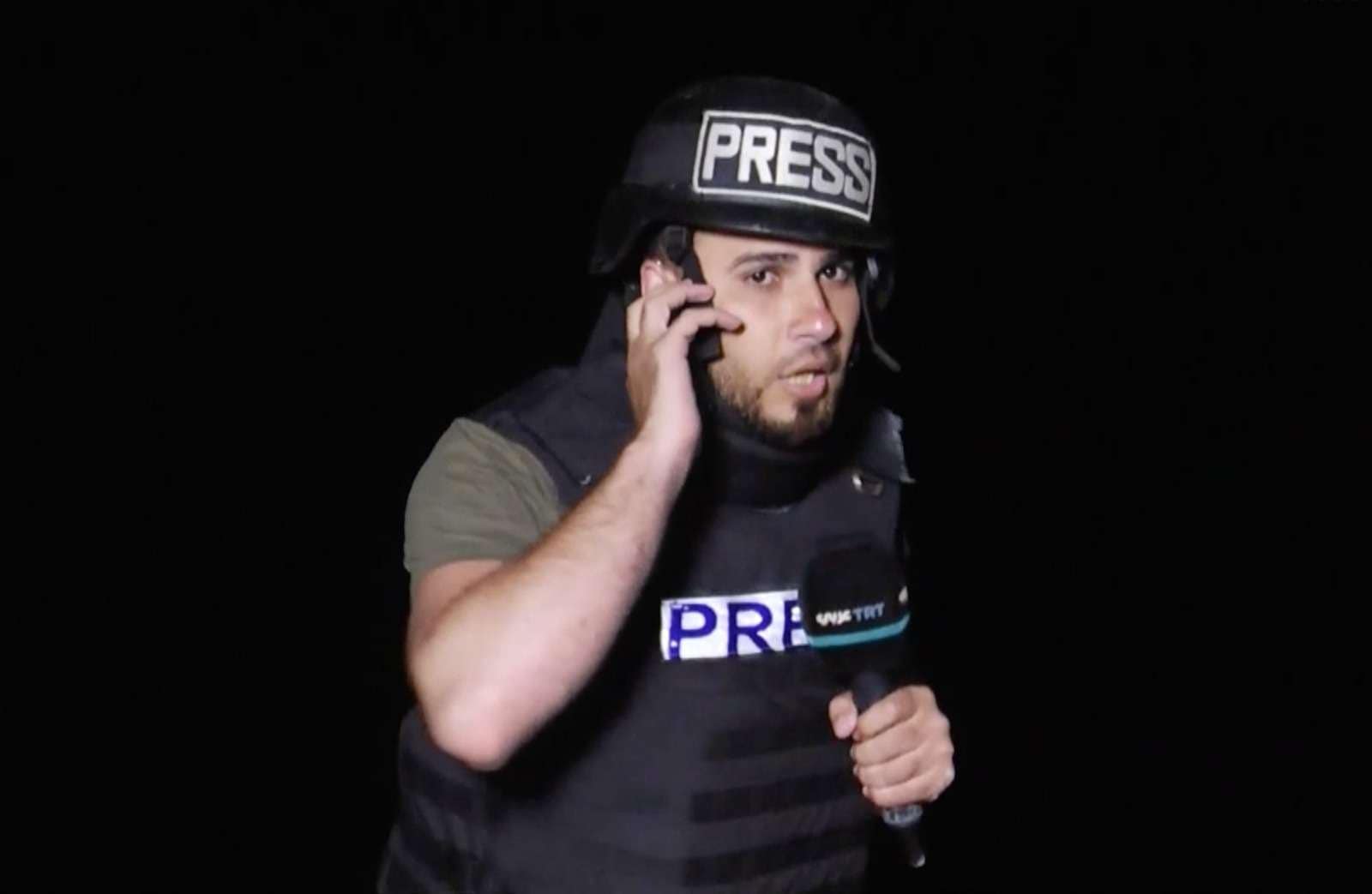 إصابة الصحفي سامي برهوم مراسل قناة TRT على الهواء مباشرة أثناء نقل صورة الاوضاع في قطاع غزة.