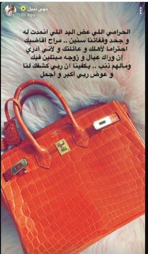 وقالت نهى نبيل بفيديو عبر (سناب شات)، إن هذا الشخص الذي استضافته في منزلها لمدة يومين بسبب مروره بحالة نفسية سيئة، قام بسرقة حقيبه يدها من ماركة هيرميس، ويبلغ سعرها 600 ألف ريال سعودي (160 ألف دولار أمريكي).