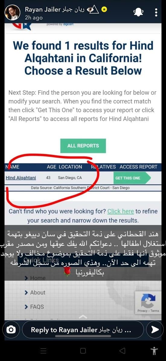 ونشر ريان جيلر صورة عبر حسابه على (سناب شات) لسجل الشرطة يؤكد أنباء القبض على هند القحطاني، وكتب في تعليقه: (هند القحطاني على ذمة التحقيق في سان دييغو بتهمة استغلال أطفالها.. دعواتكم الله يفك عوقها.. ومن مصدر مقرب موثوق أنها فقط على ذمة التحقيق بموضوع مخالف ولا توجد تهمة إلى حد الآن.. وهذه الصورة من سجل الشرطة بكاليفورنيا).