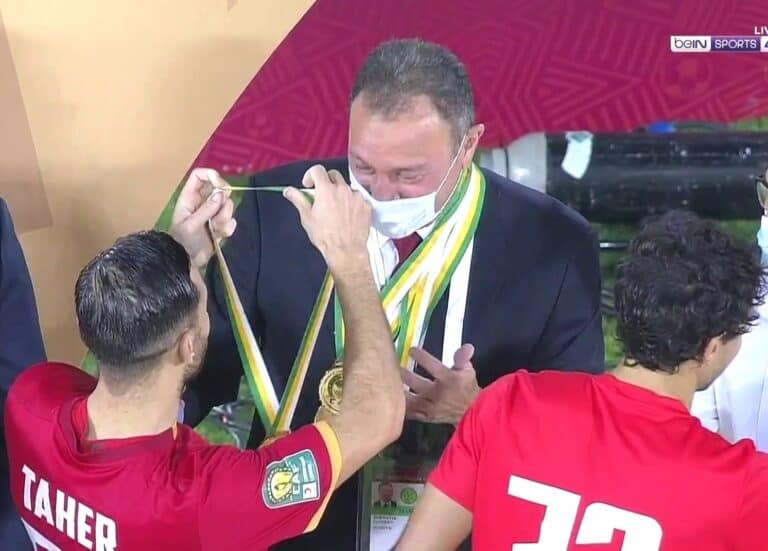 فقد خلع فريق الأهلي ميدالياتهم التي تسلموها أثناء التتويج بلقب كأس السوبر الأفريقي، وقاموا بتقليدها لرئيس النادي وأسطورة القارة الأفريقية في عالم كرة القدم “محمود الخطيب” تقديرًا لرئيسهم.