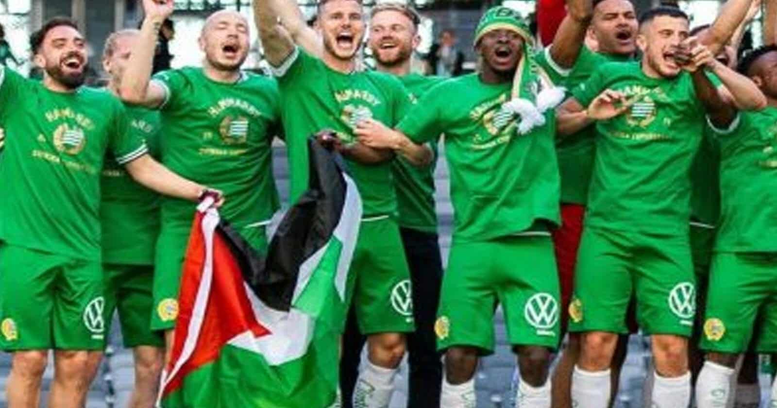 وطن- شهدت احتفالات فريق هاماربي السويدي خلال مراسم التتويج بكأس السويد لكرة القدم، رفع الفريق العلم الفلسطيني تعبيرًا عن تضامنهم مع القضية الفلسطينية.