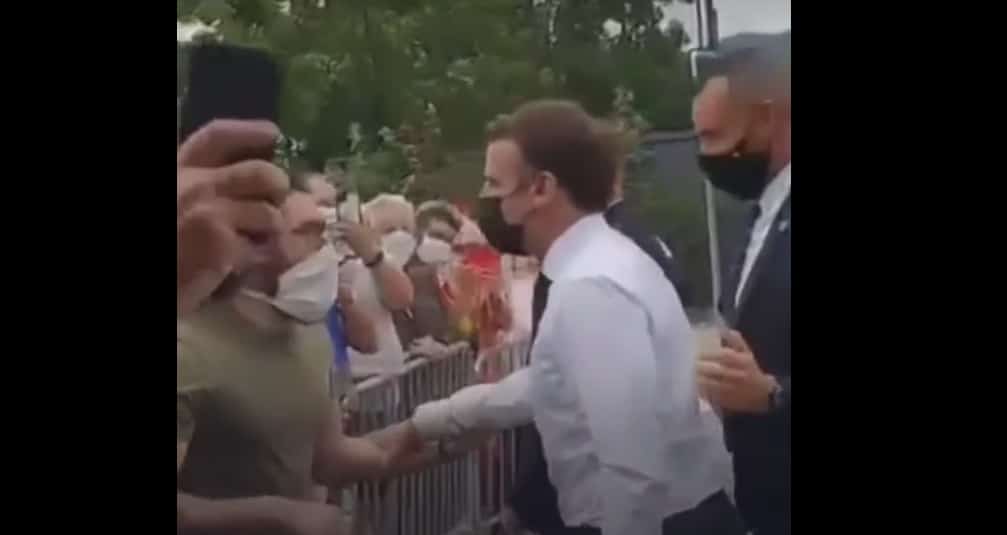 وفور اقتراب ماكرون من الحشد مد إليه رجل يلبس “تيشرت” أخضر ويرتدي كمامة، يده ليصافحه وفجأة هتف في وجه “تسقط الماكرونية” ثم صفعه بيده على وجه.
