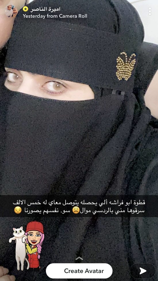 وظهرت أميرة الناصر بفيديو نشرته عبر (سناب شات)، وهي تُعلن عن مكافأة بقيمة 5000 ريال (1350 دولار)، لمن يعيد لها نقابها الذي ضاع أثناء تواجدها في أحد المراكز التجارية.