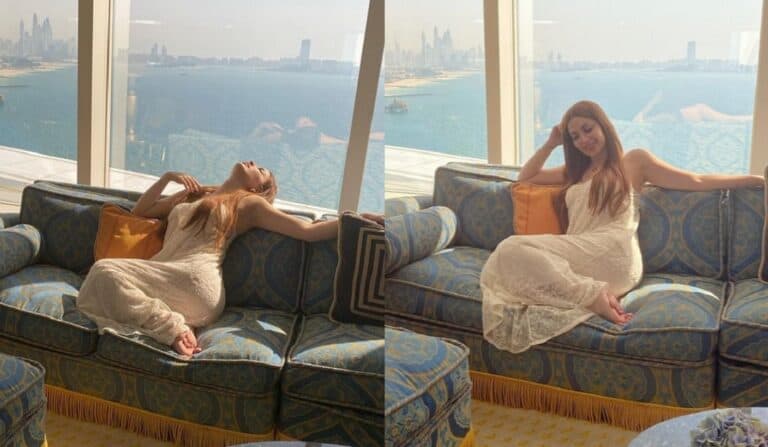 ونشرت الفنانة السورية صوراً لها وهي تسبح في أحد الأحواض المائية في برج العرب بإمارة دبي في الإمارات .