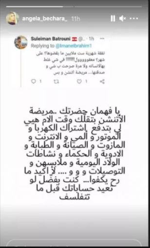 ويبدو أن أنجيلا قد تعرضت لانتقادات وهجوم متابعيها، وهو الذي يفسره ردها في وقت لاحق عليهم حين كتبت: (وقت الأم هي اللي بتدفع اشتراك الكهربا والموتور والمي والانترنت والمازوت والصيانة والأدوية والحكما ونشاطات الولاد اليومية وملابسهن والتوصيلات وغيرها، لأ أكيد ماراح يكفوا).