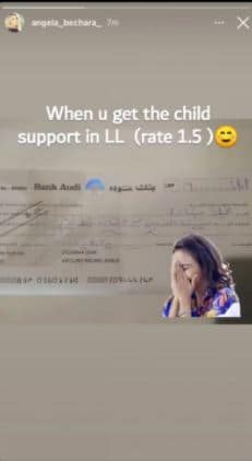 وعبر خاصية (الستوري) على حسابها عبر (انستجرام)، نشرت أنجيلا بشارة صورة الشيك الذي يكشف قيمة النفقة التي تتقاضاها من وائل كفوري، مبينة أنه لم يحتسبها على سعر الصرف الرسمي للدولار في لبنان والذي لا تتجاوز قيمته 10% من السعر الحقيقي.