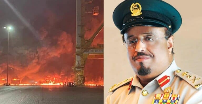 وكان ضاحي خلفان تميم قال في تغريدات سابقة، إن “الكونتينر الذي اشتعل فيه الحريق في الباخرة به مواد اذا كان التخزين سيء قد يؤدي إلى اشتعالها”.