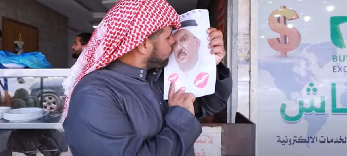 وأظهر الصورة رجلان يرتديان زياً بدوياً، ويقومان بتعليق صورة للسفير العمادي، عليها “قُبلة”، فيما اعتبر ترحيباً بوصول السفير القطري.