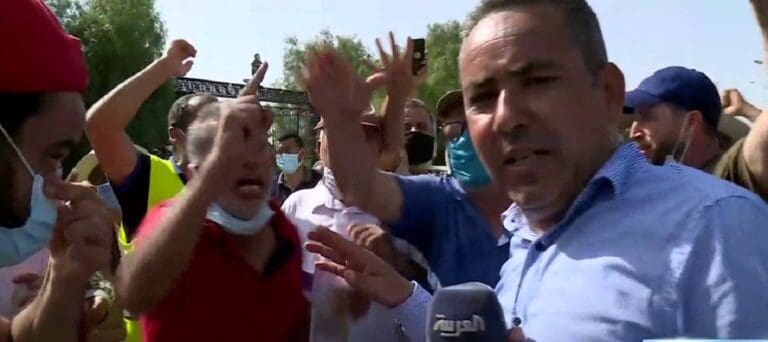 أقدم أنصار حزب النهضة في تونس، على طرد مراسل قناة العربية الحدث، من أمام مقر البرلمان الذي يعتصمون أمامه رفضاً للانقلاب الذي يقوده الرئيس قيس سعيد.
