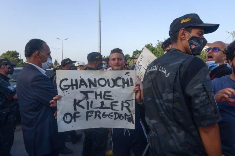 ورأى أن الفصل (المادة) 80 من الدستور لا يسمح لسعيد باتخاذ هذه القرارات، وأضاف “عندما يبلغ الأمر برئيس الجمهورية أن ينقلب على المسار الديمقراطي والحرية والثورة نقول له: قف”.