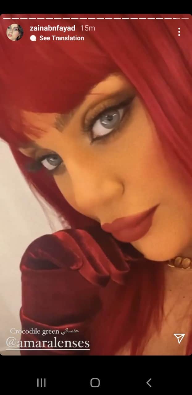 وكتبت في تعليقها: (أشعر شعور جيد بعد ما شلت اللصقات، هيدا اللوك كان فكرة ومكياج وابداع صديقتي اللي اصرّت عالشعر الاحمر).