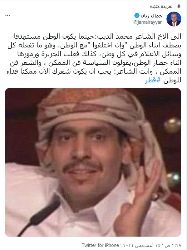 وقال جمال ريان في تغريدةٍ نشرها بـ”تويتر” ورصدتها “وطن”: “الى الاخ الشاعر محمد بن الذيب:حينما يكون الوطن مستهدفا يصطف ابناء الوطن “وإن اختلفوا “مع الوطن، وهو ما تفعله كل وسائل الاعلام في كل وطن، كذلك فعلت الجزيرة ورموزها اثناء حصار الوطن”.