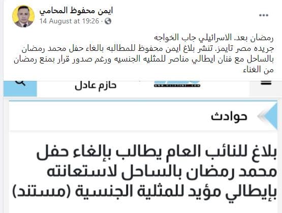 وطن- تقدم محامي مصري ببلاغ ضد مواطنه الفنان محمد رمضان، طالب فيه بإلغاء حفله المقبل في الساحل الشمالي، بسبب استعانته بممثل إباحي.