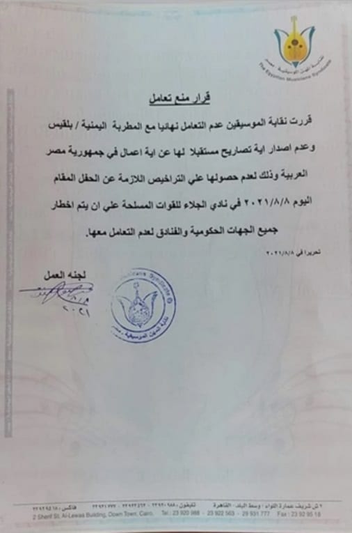 وجاء في البيان الذي أصدرته النقابة: “قررت نقابة الموسيقيين عدم التعامل نهائيًا مع المطربة اليمنية بلقيس وعدم إصدار أية تصاريح مستقبلًا لها عن أية أعمال في جمهورية مصر العربية، وذلك لعدم حصولهما على التراخيص اللازمة عن حفلها بنادي الجلاء للقوات المسلحة، على أن يتم إخطار جميع الجهات الحكومية والفنادق لعدم التعامل معها”.