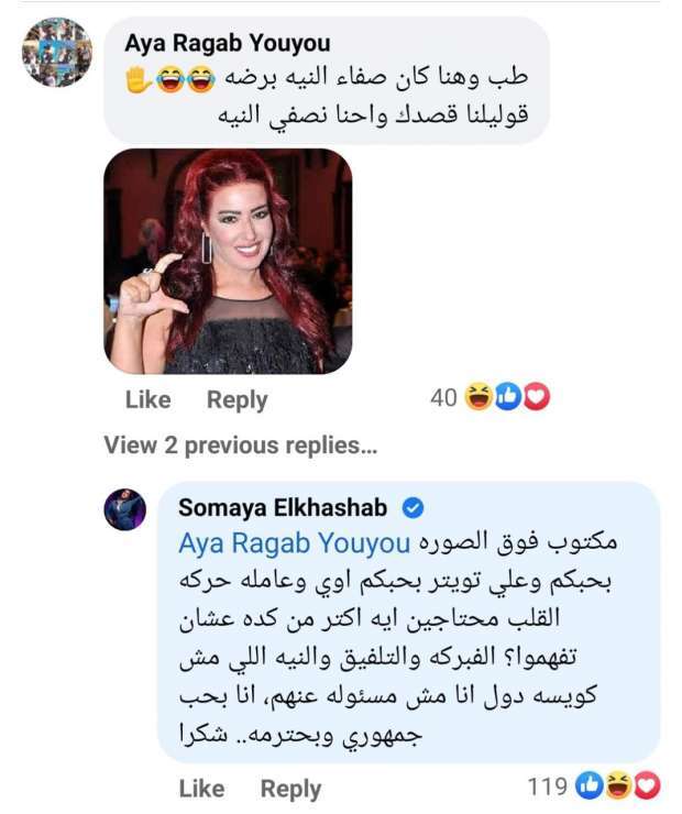 انا غير مسئوله عن اي نوايا سيئه لا تخصني ما لم اصرح بها، فبركه غرضها اثاره الفتن وكل السكرين شوتس والردود عليها مفبركه وارجو من بعض الساده الصحفيين والاعلاميين تحري الدقه قبل طرح اي موضوع وعرض اي سكرين شوت لانه كله متفبرك ومتركب عن طريق رواد التواصل الاجتماعي.. #سمية_الخشاب