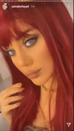 وكتبت في تعليقها: (أشعر شعور جيد بعد ما شلت اللصقات، هيدا اللوك كان فكرة ومكياج وابداع صديقتي اللي اصرّت عالشعر الاحمر).