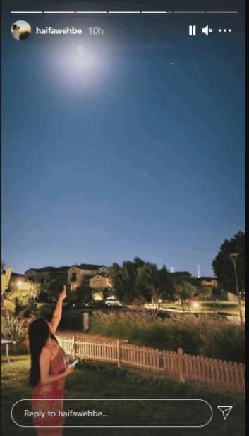 ونشرت هيفاء وهبي عبر خاصية الستوري على حسابها عبر (انستجرام)، مجموعة من الصور، التقطتها في أحد المناطق في أوقات المساء، وظهرت في إحداها وهي تشير الى القمر، وتمسك بهاتفها، وترتدي فستاناً قصيراً.