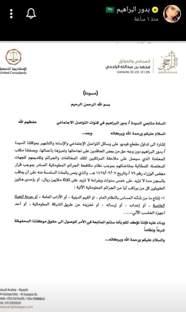 ونشرت بدور البراهيم عبر (سناب شات)، صورةً من بيان محاميها محمد عبدالله الراجحي، والذي توعد بملاحقة كل من نشر المقطع، سواء أشخاصاً أو حسابات في مواقع التواصل، واصفاً إياهم بالحاقدون على النجاحات التي حققتها وتميزها بأعمالها.