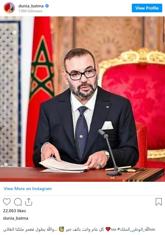 ونشرت دُنيا بطمة، صورة الملك محمد السادس على حسابها في انستغرام، وعلّقت بالقول: “كل عام وانت بالف خير …والله يطول فعمر ملكنا الغالي”.